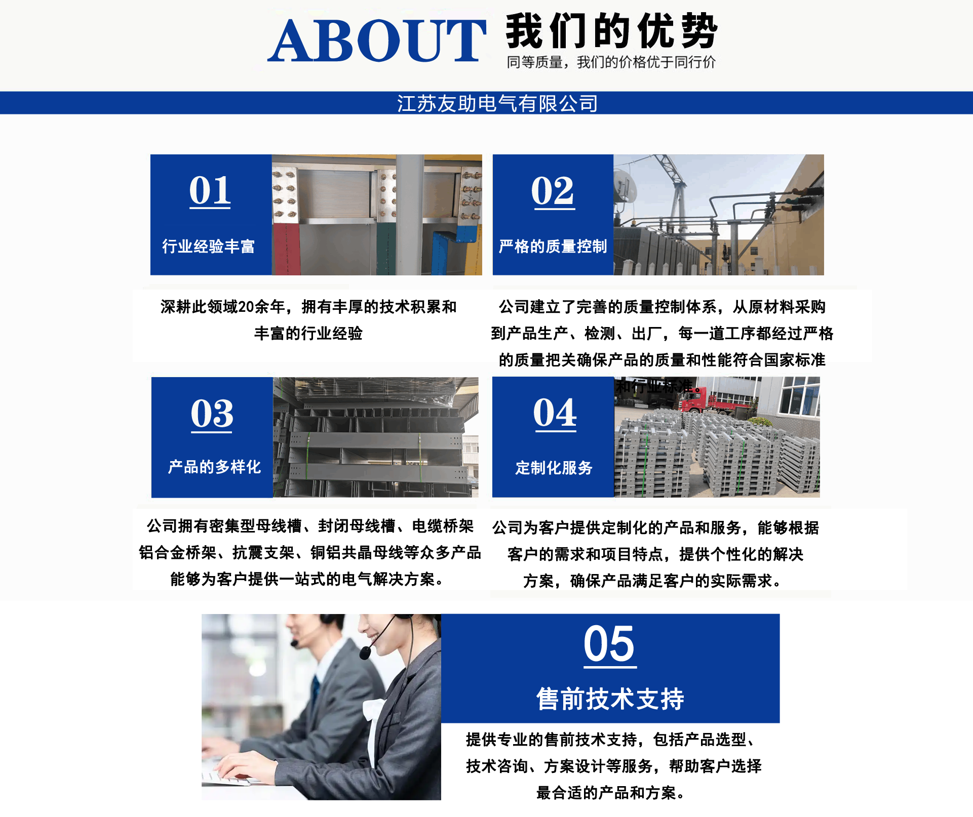 江蘇友助電氣有限公司地處中國工程電氣生產(chǎn)基地-一江蘇省揚中市。經(jīng)營范圍:電纜橋架,母線槽(橋),管型母線,銅軟連接(伸縮節(jié)),高低壓開關(guān)柜,配電箱,抗震支架產(chǎn)品系列。 公司宗旨:客戶至上。已成功為江蘇二十屆省運會會場-泰州體育館,南京寶龍商業(yè)綜合體,張家口百兆瓦風(fēng)電場,濟源市婦幼醫(yī)院,威海市未來科技園,湖北皇恩燁新材料科技有限公司,南京中央路小學(xué),南通中天大酒店,新疆新安特鋼有限公司,河北省送變電有限公司,南京南微醫(yī)學(xué)研發(fā)基地等多項工程配套服務(wù),我們愿與您精誠合作,互利共贏!公司技術(shù)人員深耕橋架,母線領(lǐng)域30年,為您提供橋架,母線槽疑難問題解決方案。母線槽不論每相是單排,雙排,三根排重疊,不管有多少個水平彎、垂直彎,轉(zhuǎn)接排在發(fā)貨前預(yù)裝一遍,確保尺寸無誤。到現(xiàn)場直接擰螺絲,效率高,橫平豎直,規(guī)規(guī)矩矩,符合標準,供電局,業(yè)主,監(jiān)理,驗收易通過。供貨周期3-7天。為了讓尊貴客戶您,設(shè)備安全通電,高枕無憂。我們提供如下售前售中售后服務(wù): 售前:免費技術(shù)支持,咨詢。 售中:免費現(xiàn)場精確測繪、設(shè)計。 售后:安裝服務(wù),免費指導(dǎo)。 質(zhì)量是生命,客戶是源泉。承諾客戶的,一定全力做到。讓我們一起進步!...